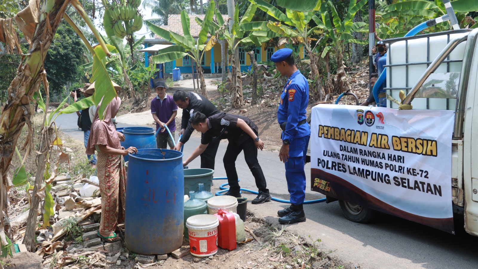 Peringati Hari Jadi Humas Polri ke-72, Humas Polres Lamsel Bagikan Air Bersih ke Warga Desa Kelawi.